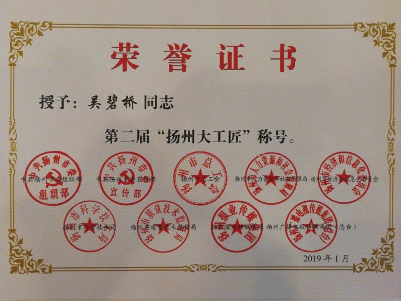 公司總工吳碧橋同志榮膺第二屆“揚(yáng)州大工匠”稱號(hào)
